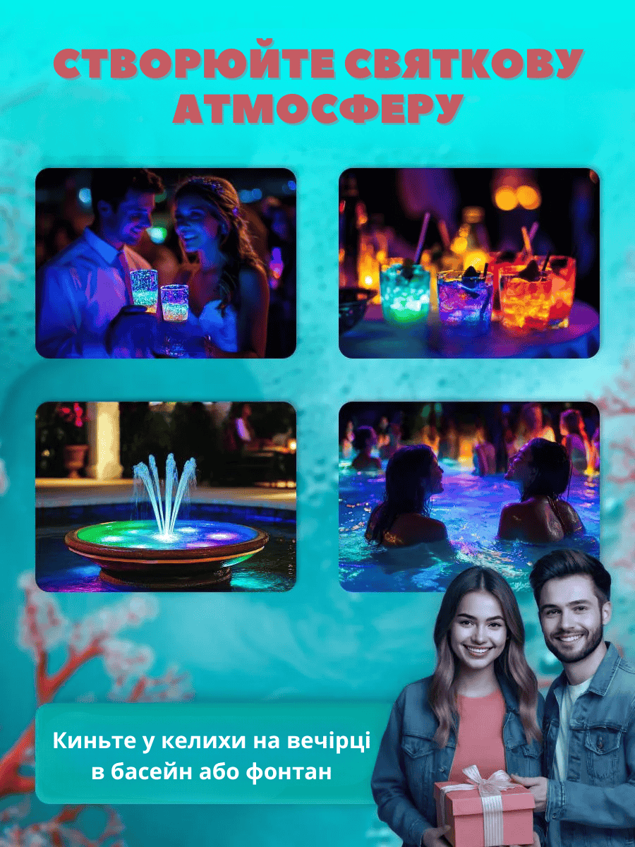 Дорослим як оригінальний декор для весіль фотосесій побачень та вечірок, як стильні елементи в кафе-барі, басейні ванні, а так само фонтані в нічних клубах та кальянних.