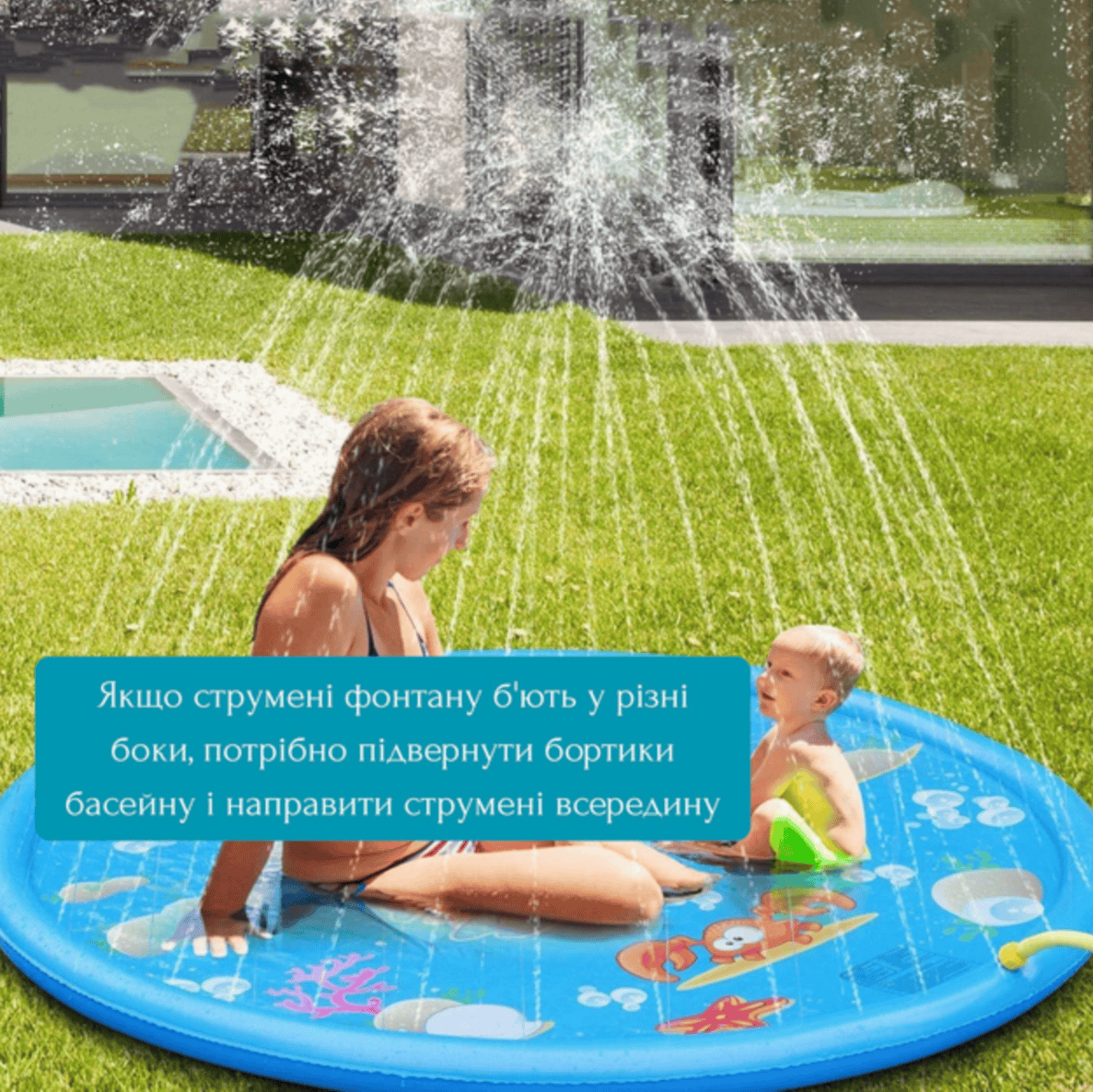 Басейн вміщує достатню кількість води для дитячих веселощів, але також підійде і для дорослих, щоб охолодитися в літню спеку або просто повеселитися з дітьми. Цікавий фонтан із безперервними струменями забезпечить радість і сміх дітей, а регулювання висоти струменів дасть змогу налаштувати їх на будь-який смак.