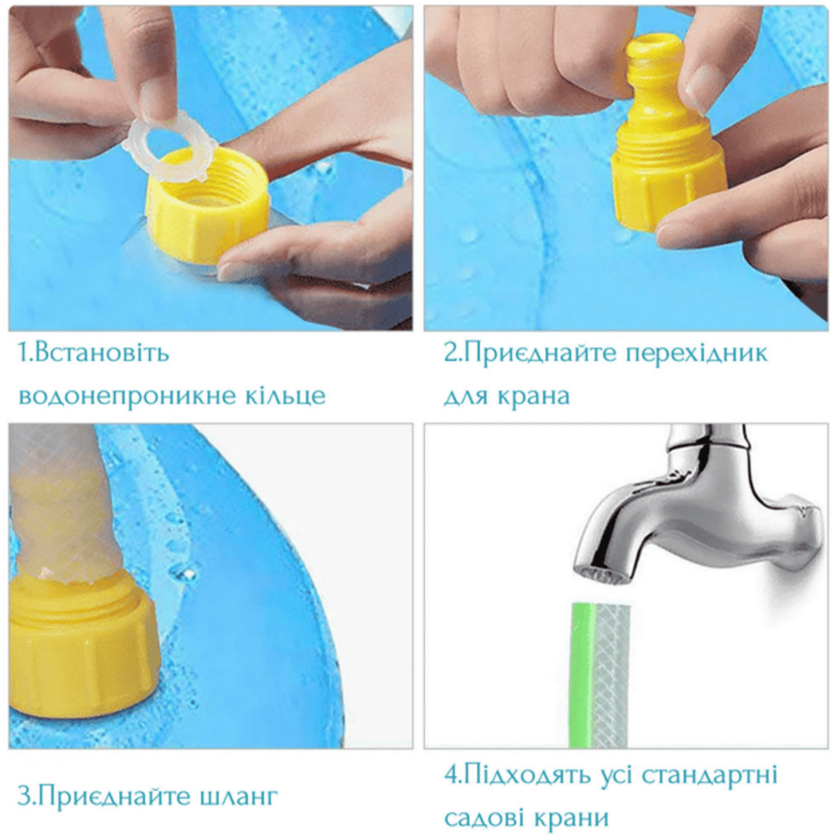 Цей дитячий басейн легко і швидко встановлюється без допомоги насоса, Вам знадобиться тільки джерело водопровідної води і шланг. Дуже легко підключається, просто приєднайте садовий шланг до спеціального перехідника, який йде в комплекті, наповніть басейн і відрегулюйте висоту струменів за допомогою напору води. Якщо струмені фонтану б’ють у різні боки, потрібно підвернути бортики басейну і направити струмені всередину.