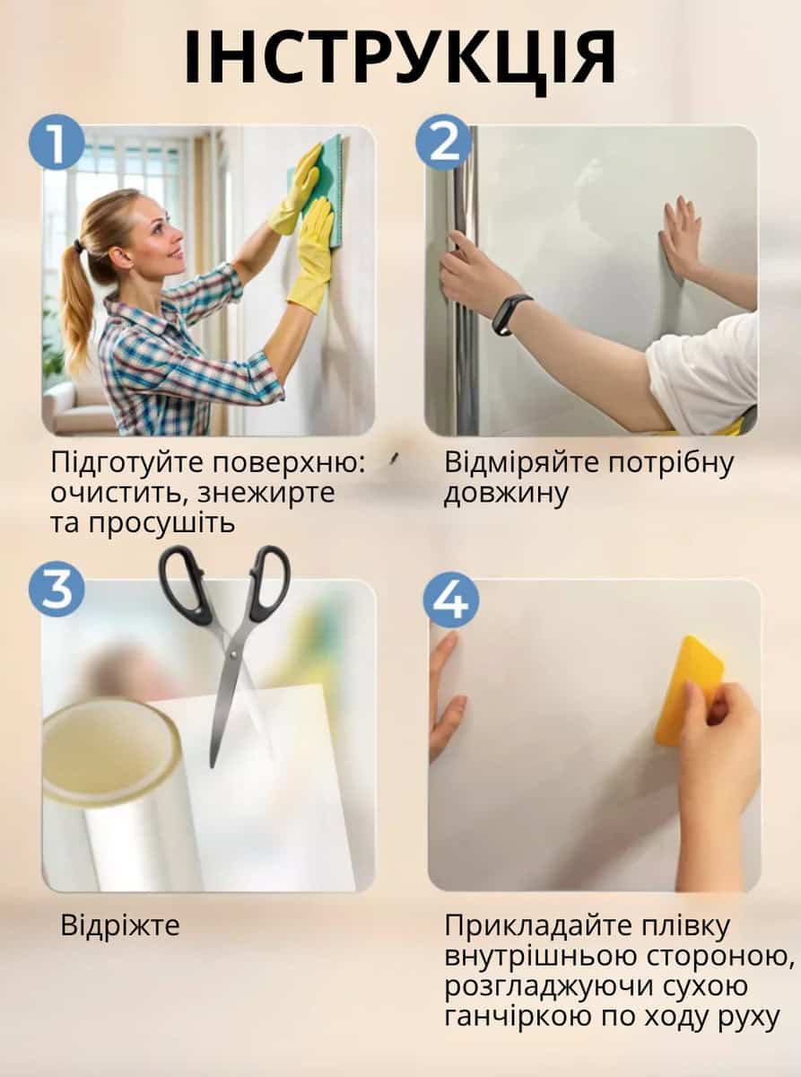 Завдяки спеціальній технології електростатичного прилягання плівка тримається без клею, що дозволяє легко її закріплювати та знімати без залишків чи пошкоджень. Стане незамінним аксесуаром у вашому інтер’єрі: на кухні, в офісі чи дитячій кімнаті, забезпечуючи чистоту та охайний вигляд приміщень.