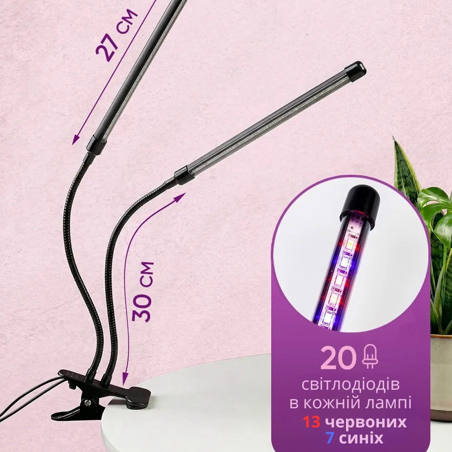 Енергоефективна потужність 20 Вт гарантує яскраве освітлення при мінімальному споживанні електроенергії. Фітолампа легко кріпиться до столу або полиці та чудово підходить для використання вдома, на балконі чи в теплиці.
