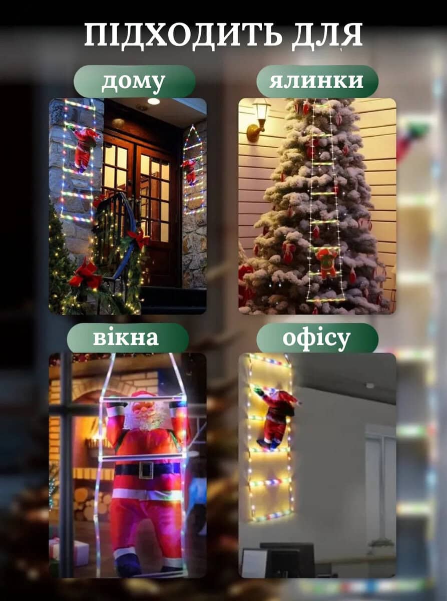 Здається, що Санта Клаус підіймається по сходах, а його яскраві вогники створюють атмосферу радості та затишку. Такий декор чудово підходить для ялинки, вікна, дверей або вітрини.