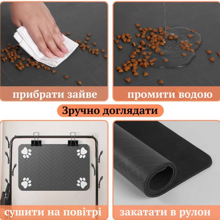 Легко чистити. Поверхня нашого килимка для корму для домашніх тварин виготовлена зі спеціального матеріалу, стійкого до пилу та шерсті домашніх тварин.. Просто протріть його вологою тканиною або промийте водою. Слідкуйте за гігієною місця, де живе домашня тварина.