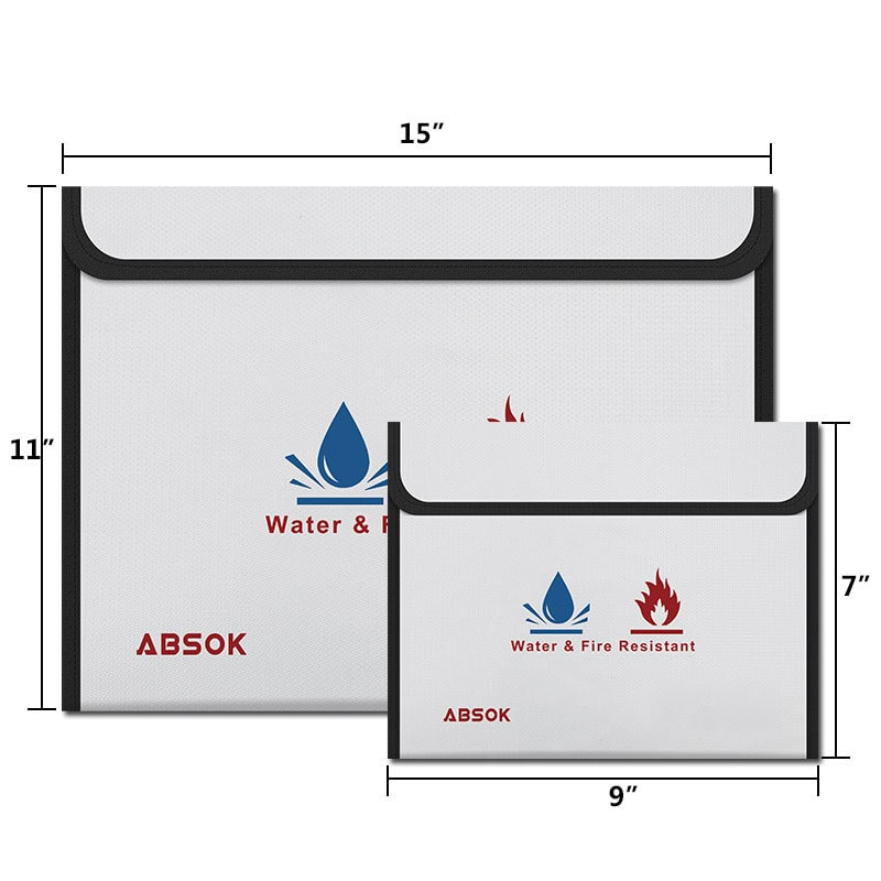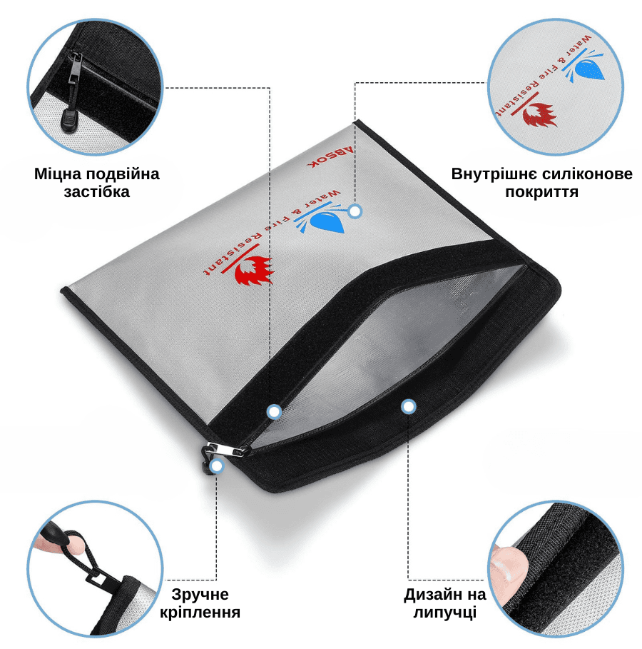 Матеріал конвертів стійкий до екстремально високих температур (до 5200°F / ≈2870°C) і водонепроникний, що гарантує збереження вмісту навіть при пожежі або затопленні. Подвійна застібка з липучкою та блискавкою додатково захищає від проникнення пилу, води й вогню.