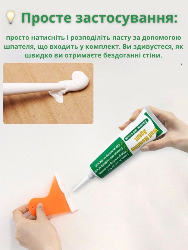 Завдяки своїй здатності прилипати, як цвях, цю чарівну пасту можна легко нанести, видавивши її на пошкоджену поверхню та рівномірно розподіливши за допомогою шпателя, що входить у комплект. Після висихання ви можете використовувати наждачний папір, щоб згладити поверхню, якщо необхідно. Відремонтована частина стіни буде твердою, як скеля, і достатньо міцною, щоб надійно утримати навіть цвях або шуруп.