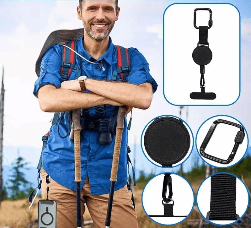 Просто зафіксуйте карабін або кліпсу на ремені, поясі, рюкзаку чи шлейці — ваш смартфон завжди під рукою, але водночас у безпеці. Регульований ремінець дозволяє змінювати довжину під ваші потреби — від короткого контролю до повного розтягнення для зручного користування телефоном без знімання.