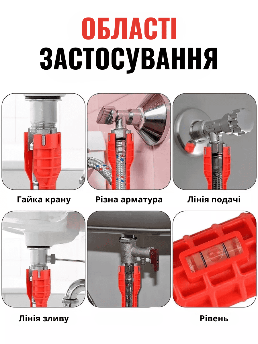 В рамках своєї універсальності цей інструмент підходить для роботи з найбільш поширеними гайками. У ньому передбачені різні прорізи та отвори, придатні для болтів різних розмірів під раковиною. Це спрощує процедуру встановлення та ремонту, роблячи роботу швидше та ефективніше.