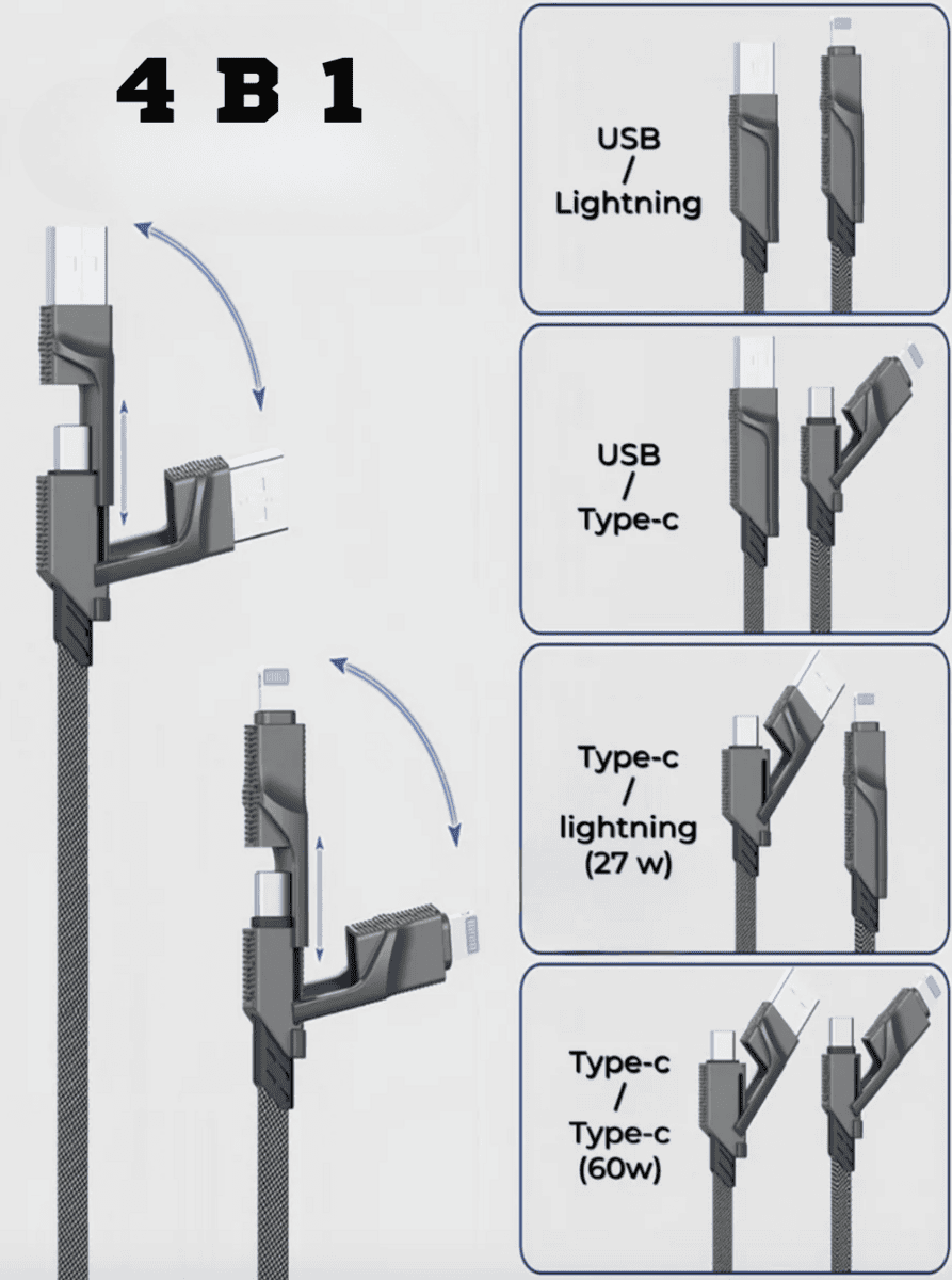 Кабель 4в1 було розроблено з метою спростити ваше життя. Він поєднує в собі чотири порти: USB A-C, USB A-Lightning, USB C-Lightning та USB C-USB-C — в одному кабелі. Немає потреби носити з собою кілька кабелів для різних пристроїв.